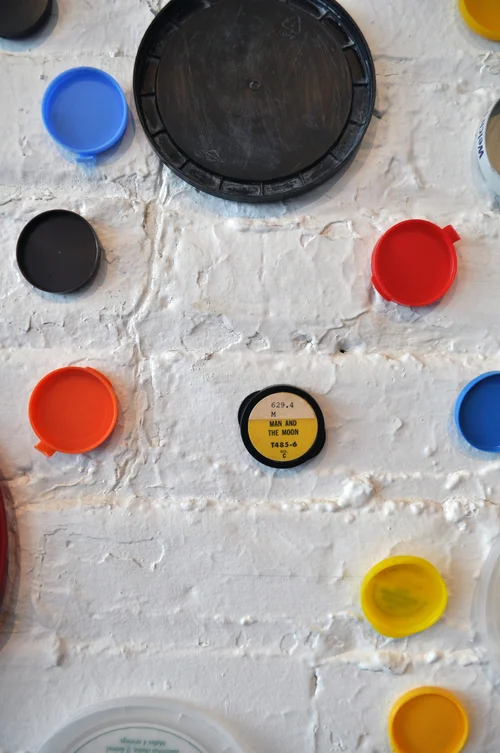 Laser engraved text on glass mirror tiles, Variable Dimensions.
